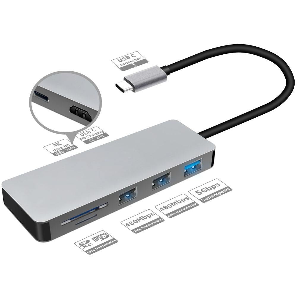 Intact 9822T USB-C 7 in 1 Multifunction Adapter HDMI/USB3.0*1/USB2.0*2/SD/TF/USB-C PD