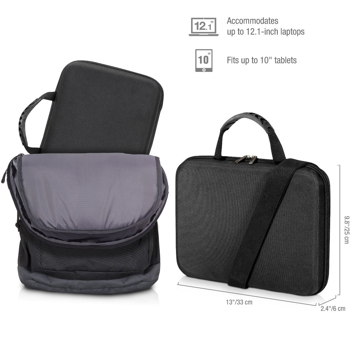 Designed to keep your netbook, laptop, MacBook air and tablet safe whilst in transit. Features a center strap to keep the device safely secured and prevent unwanted moving around within the bag. Also features padded foam inner and EVA outer shell to protect against bumps. Individual tablet/iPad felt lined pocket and internal pocket. Convenient padded shoulder strap and dual handles for carrying.