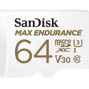 SanDisk Max Endurance 64GB microSD 100MB/s 40MB/s 20K hrs 4K UHD C10 U3 V30 -40°C to 85°C Heat Freeze Shock Temperature Water X-ray Proof SD Adapter