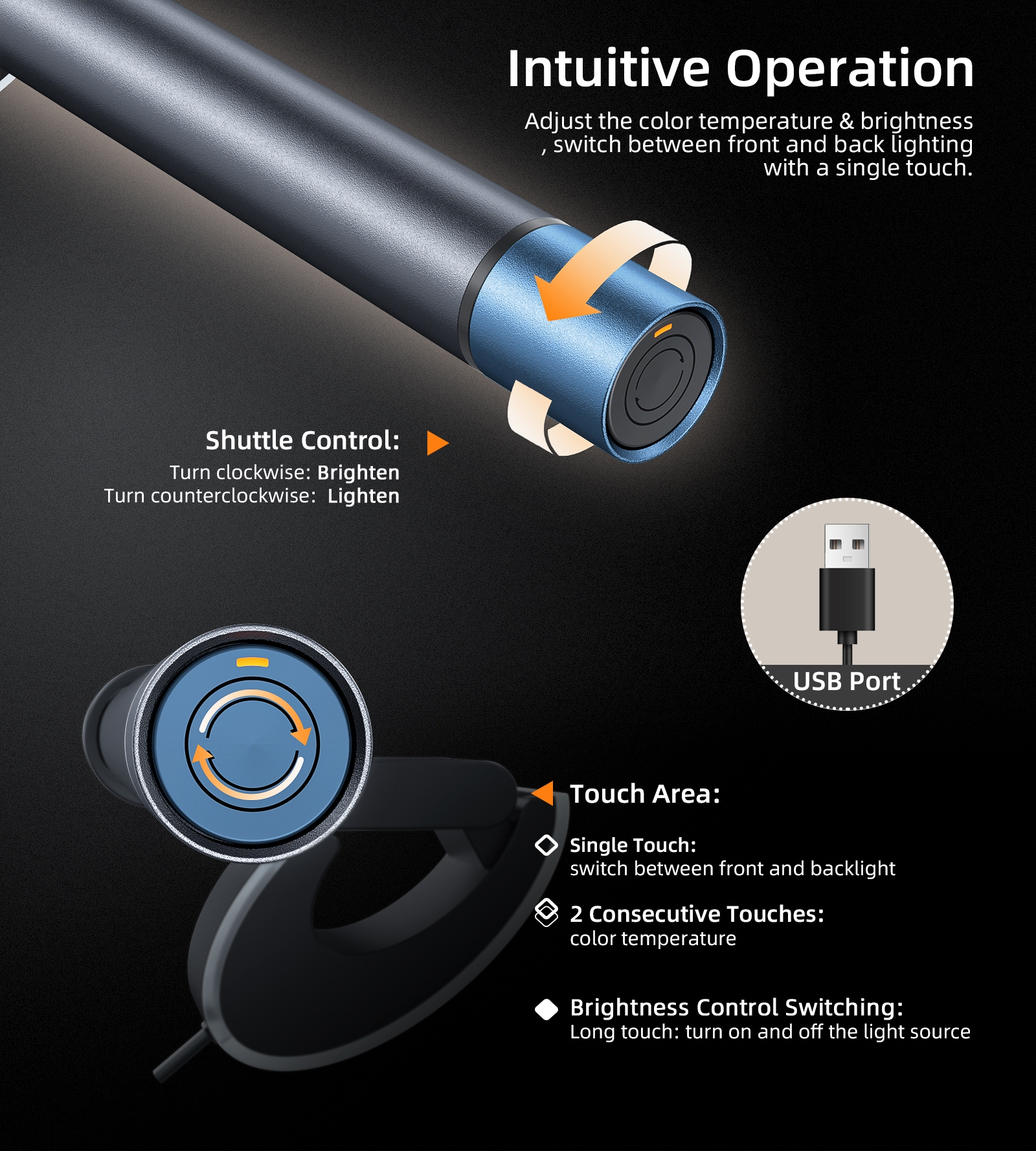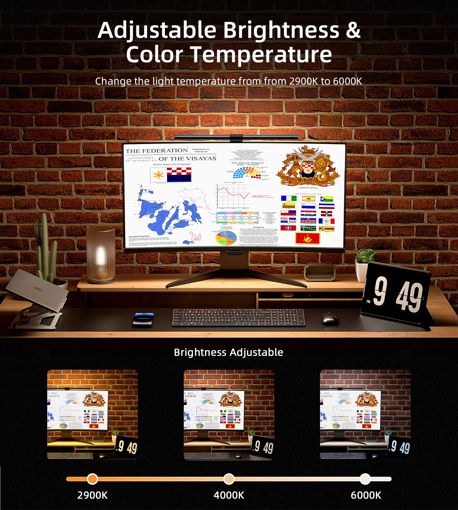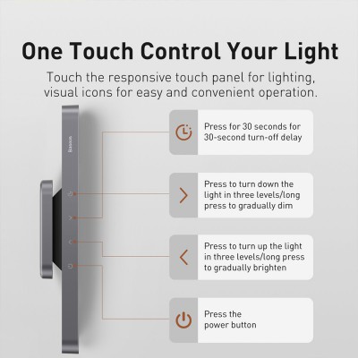 – Smooth brightness adjustment – Three color temperatures – Automatic dimming