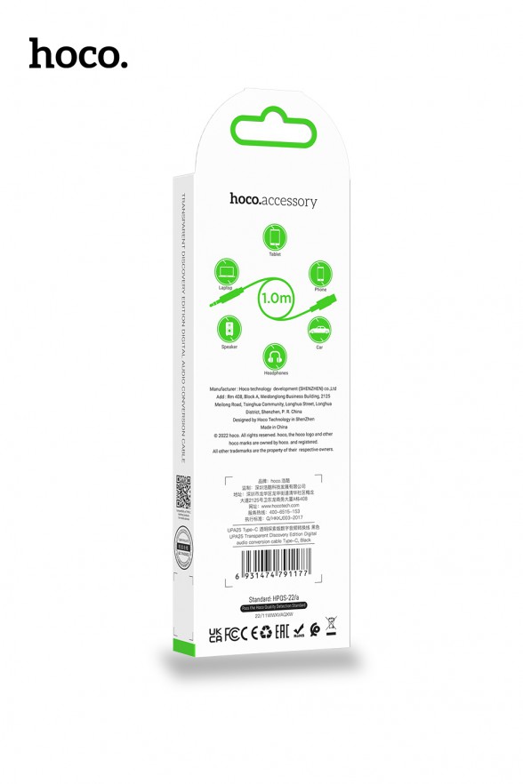 UPA22, 3.5mm male to Type-C male audio conversion cable, silicone braid, aluminum alloy connectors, 1m.