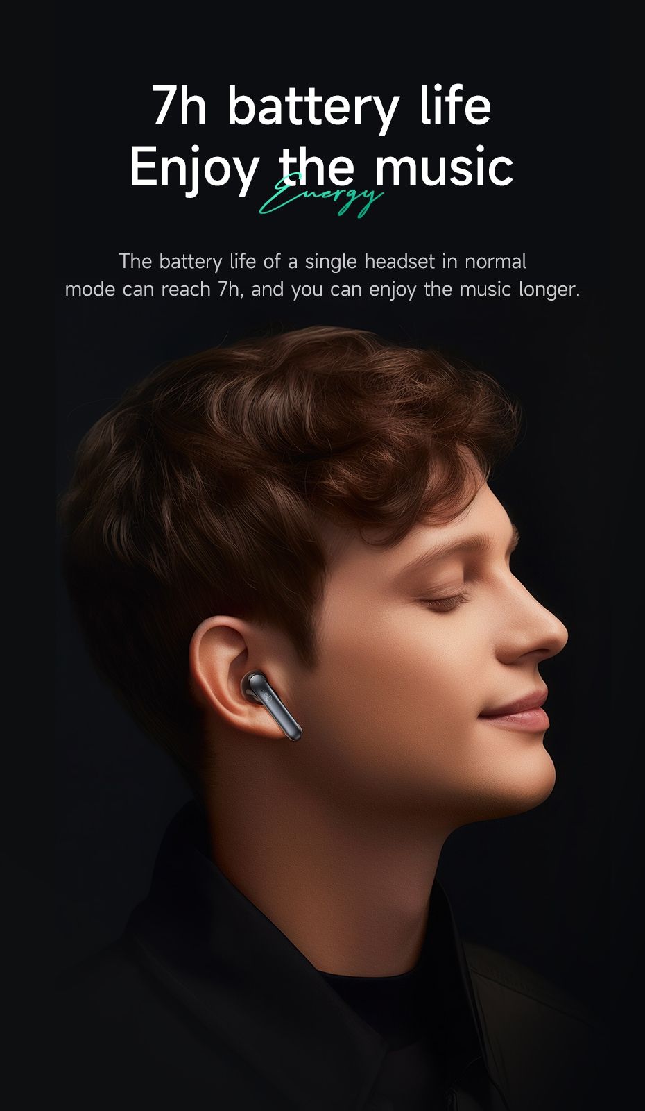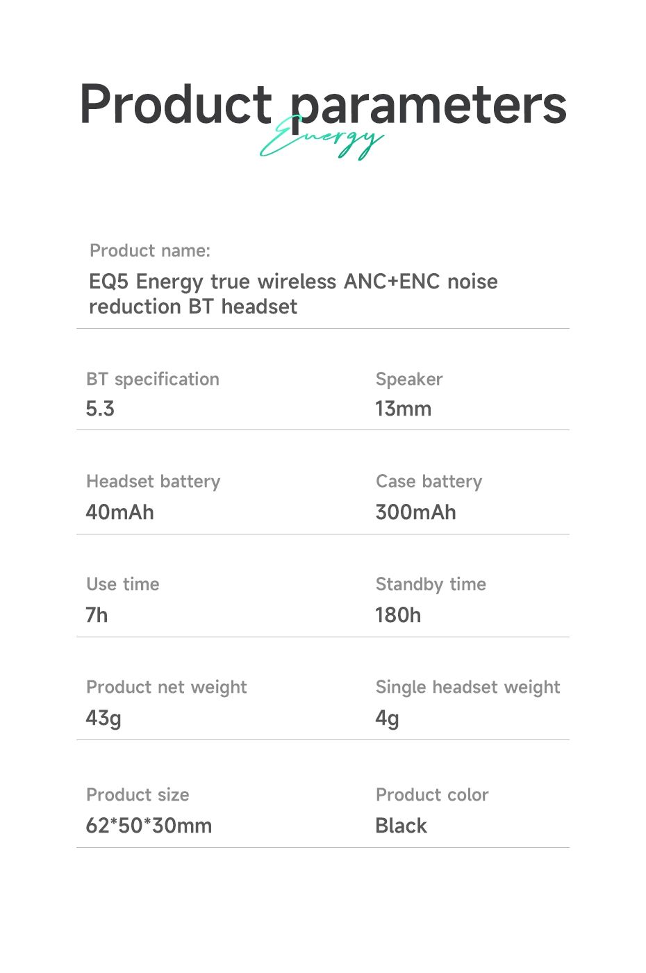 True wireless stereo headset. ANC and ENC noise reduction. Supports connection to 2 phones. BT v5.3. Use time 7 hours. Standby time 180 hours.