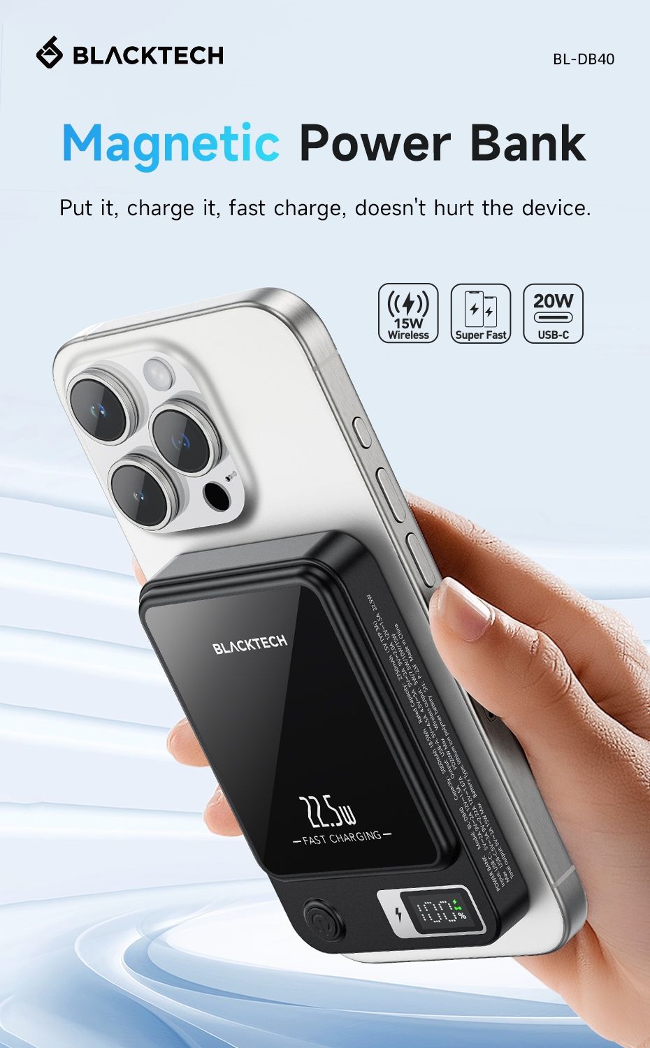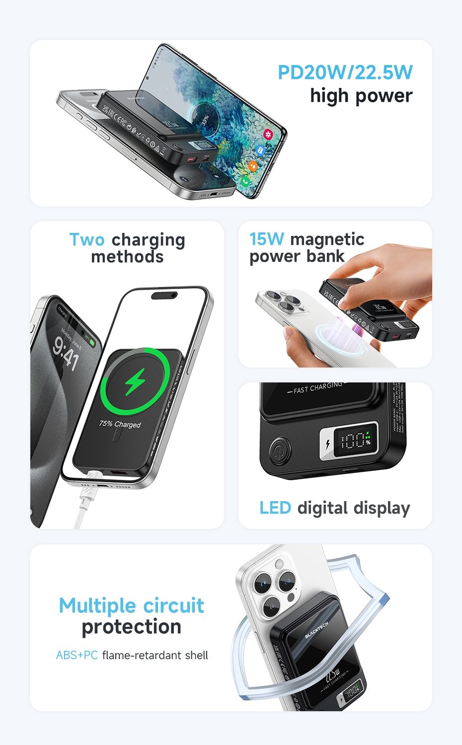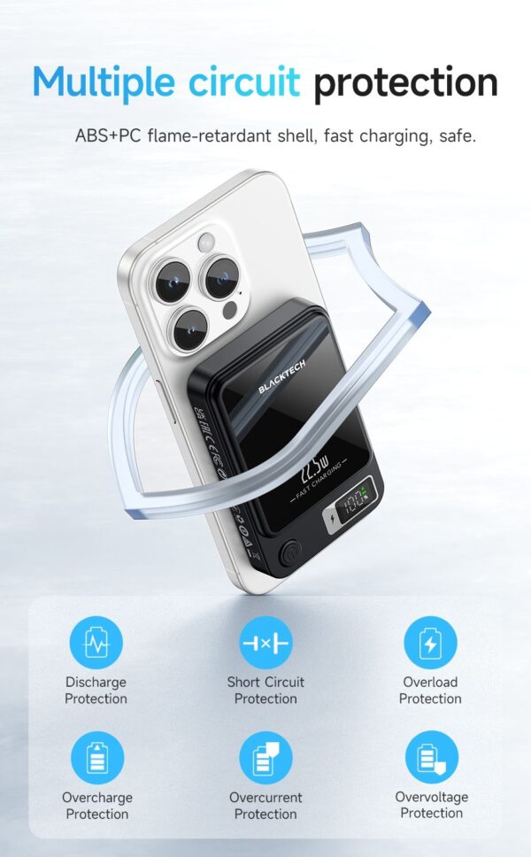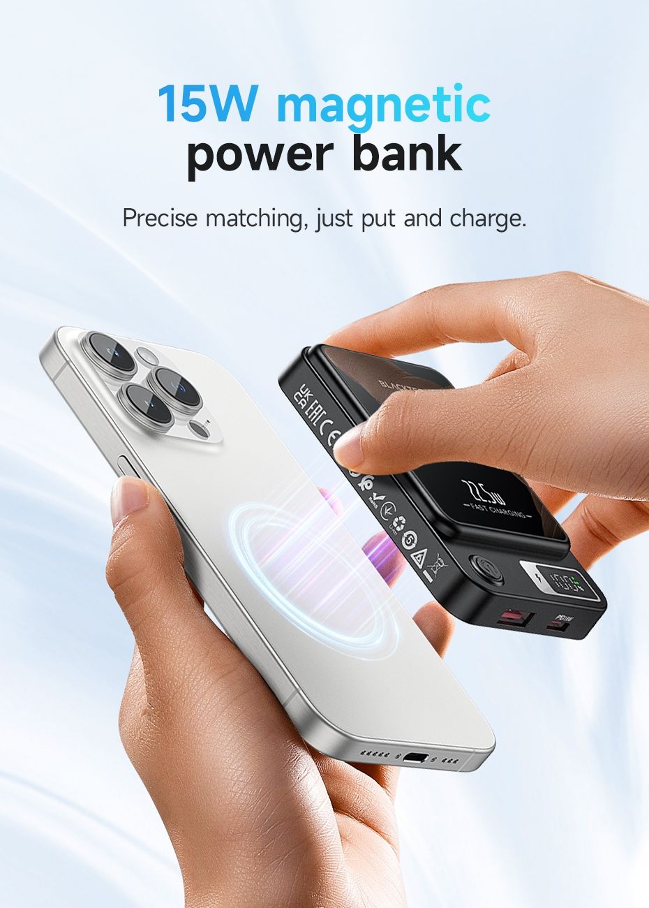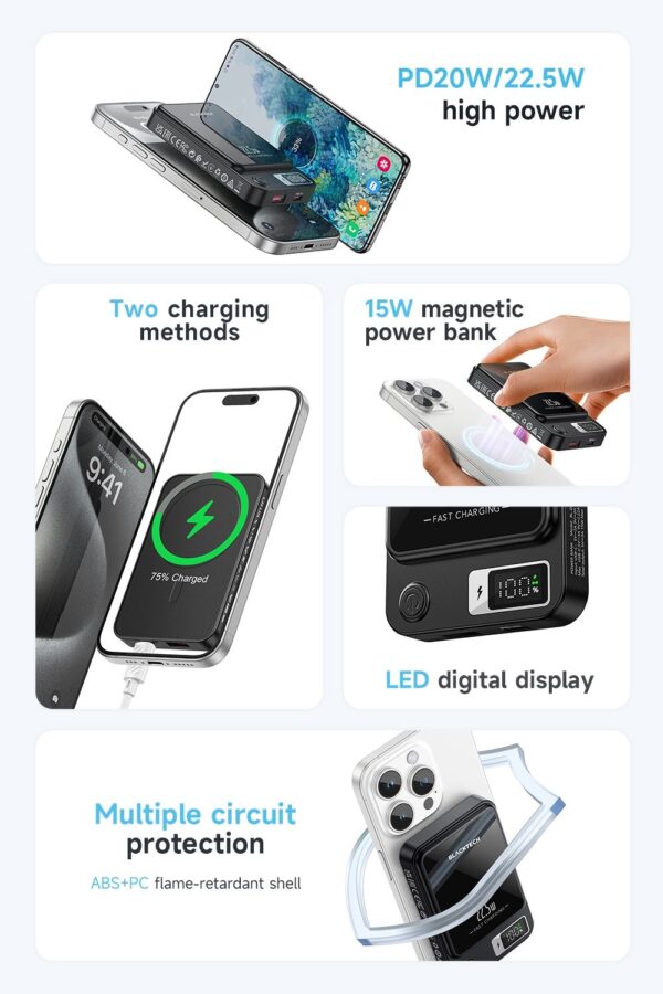 Magsafe Magnetic Charging: Elevate your charging experience with the Blacktech 20W Magsafe Magnetic Mini Power Bank, designed to seamlessly complement and enhance your iPhone 15/14/13/12’s charging capabilities.