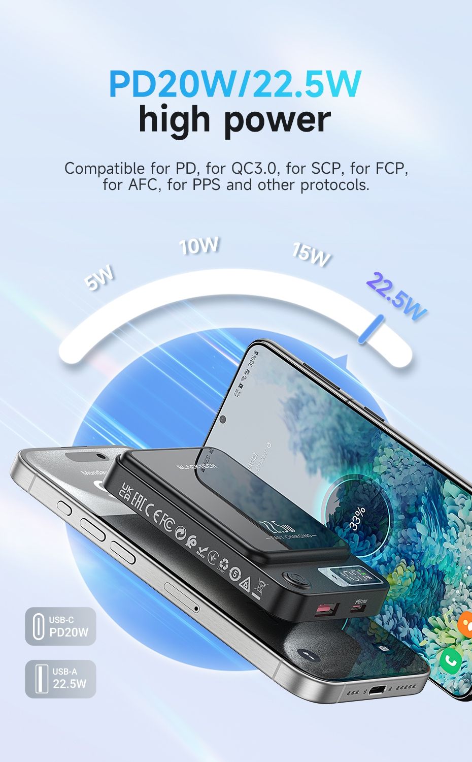 Supports for PD3.0 / PD20W / QC3.0 / QC2.0 / FCP / SCP / AFC fast charging protocols.