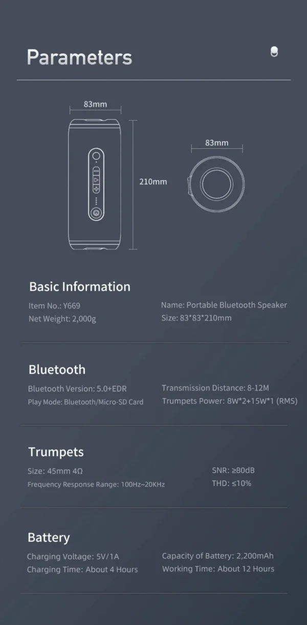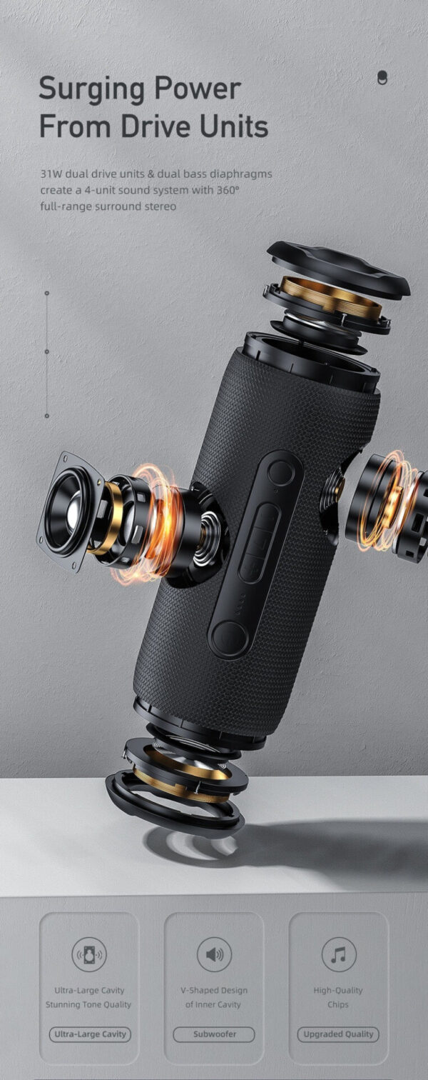 Small portable speaker The subtle little body delivers a stunning 31W sound. Carefully crafted for distortion-free sound, portable bluetooth speaker have a loud treble, crisp midrange and full bass to keep you immersive
