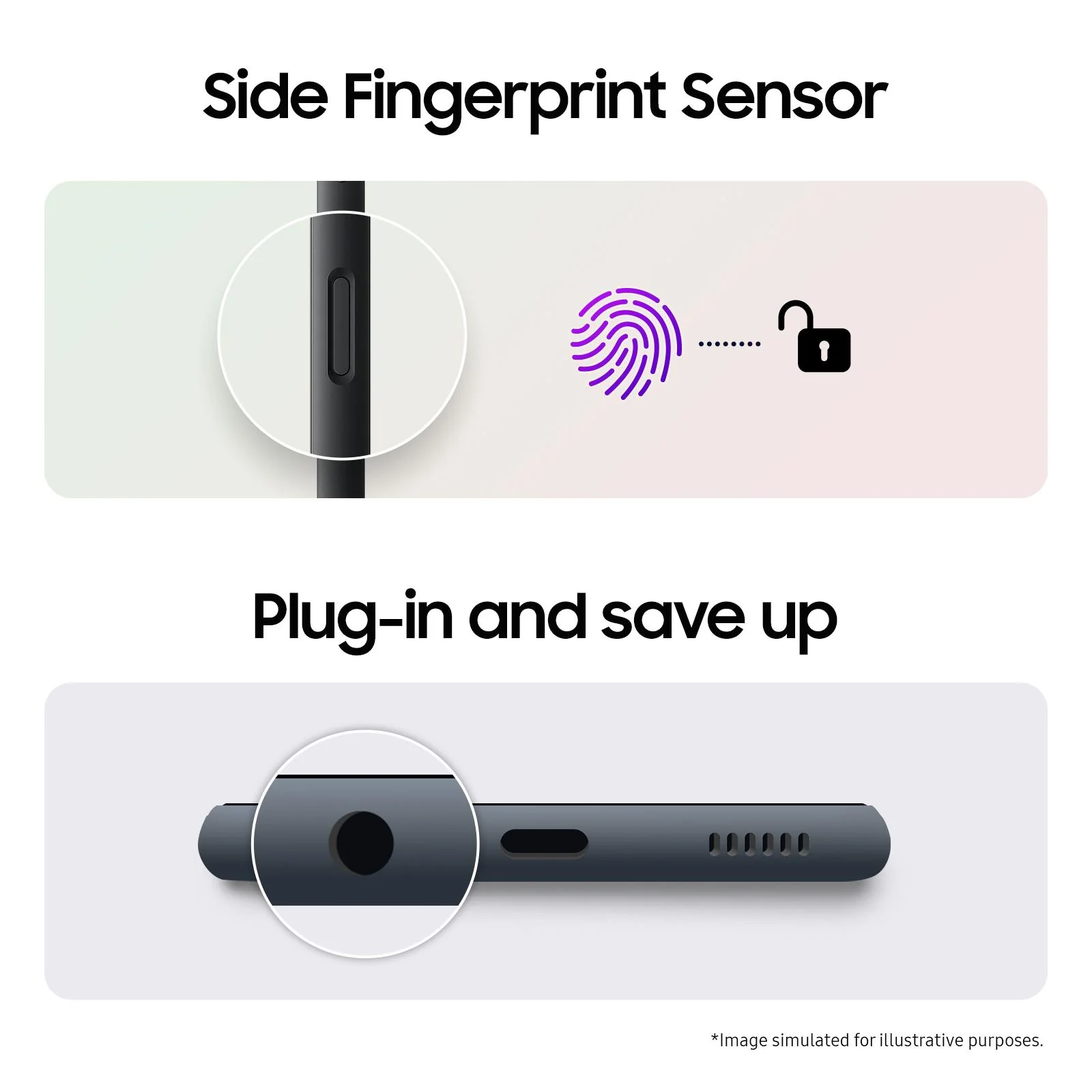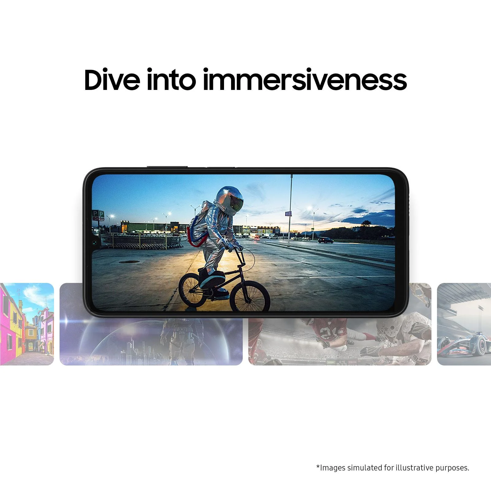 *Images simulated for illustrative purposes. Actual UI/UX may be different.**Measured diagonally, the screen size is 6.6″ in the full rectangle and 6.4″ accounting for the rounded corners. Actual viewable area is less due to the rounded corners and the camera cutout.