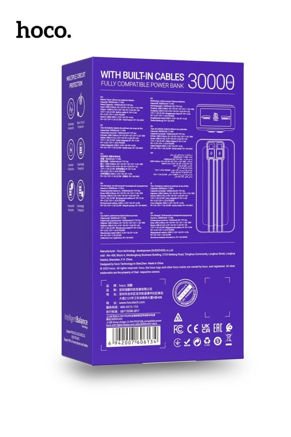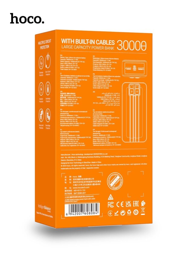 Hoco J118B 30000mAh With Built In Charging Cable Speed Energy Power Bank – Black