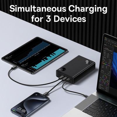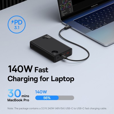 Baseus Adaman 140W portable charger offers the latest PD 3.1 technology for super-fast 140W charging and 100W rapid recharging, featuring 2 USB-C ports and 1 USB-A port to charge 3 devices simultaneously.