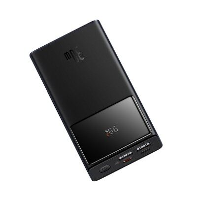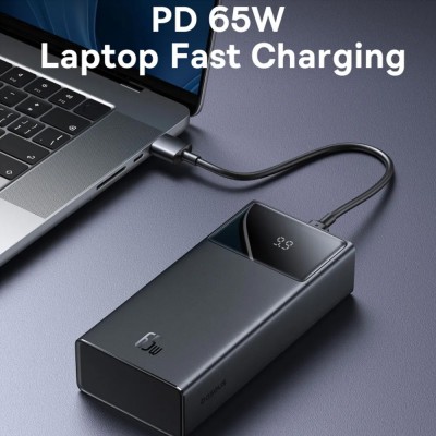 Baseus Amblight 65W Portable Charger Power Bank is a 30,000mAh capacity battery pack for fast charging laptops like a 13” MacBook Pro from 0 to 50% within an hour, and downward compatible with devices requiring less power output. It has 5 ports where all support power output and 2 supporting input.