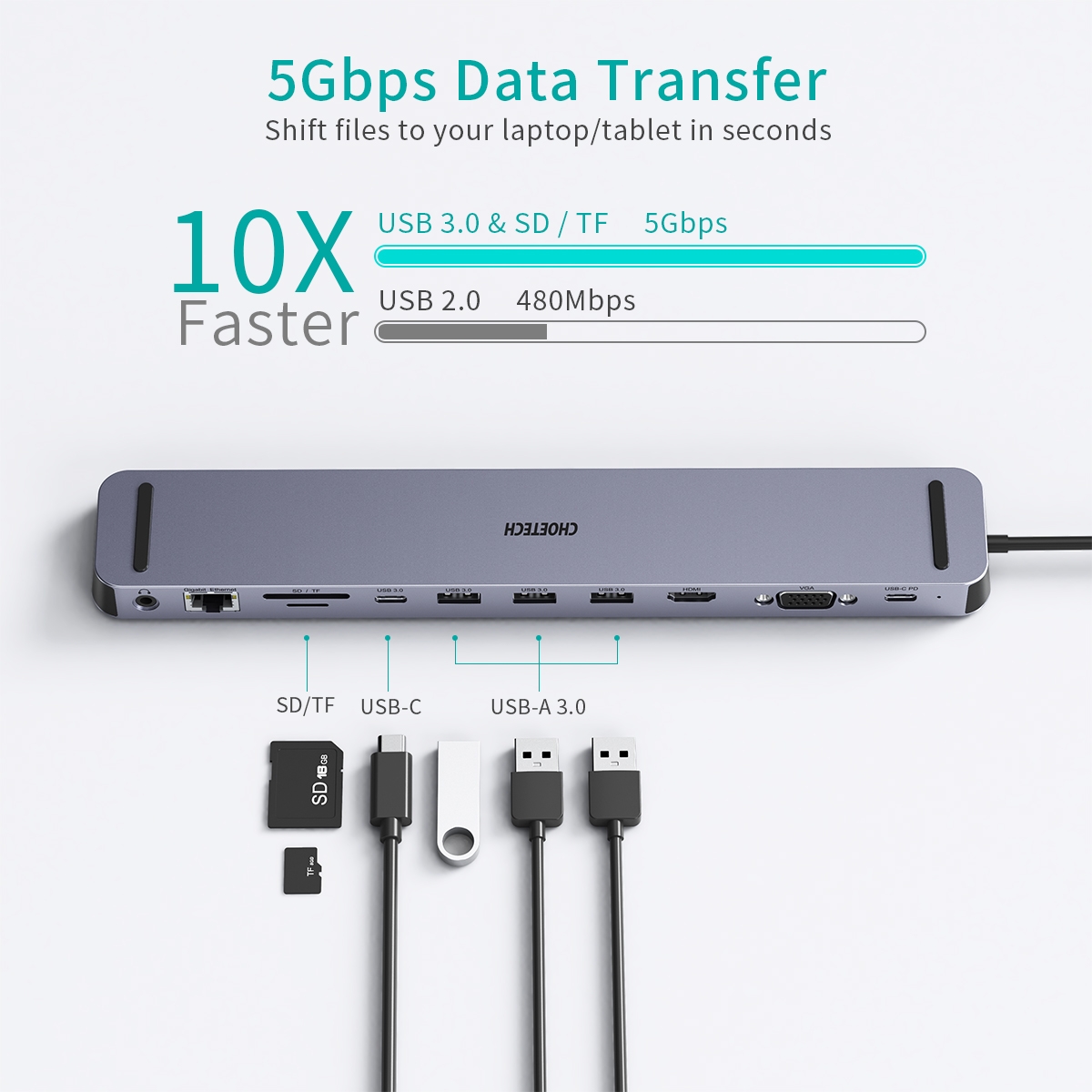 USB Type C Hub with Ultra HD 4K Output: Choetech USB-C docking station makes your life more colorful – mirror or extend your screen with the USB C adapter’s HDMI port and directly stream 4K UHD or full HD 1080P video to HDTV, monitors, or projectors for a cinema-like visual feast.