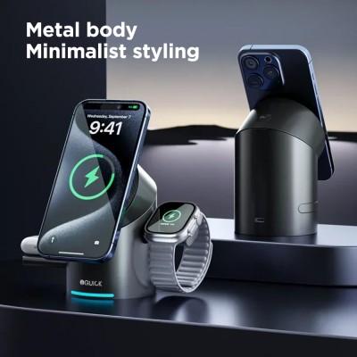 3 in 1 charger for phone 15W, earphone 3W, Watch 2.5W with adjustable ambient light. 360° Adjustable Viewing Angle, conveniently read texts or watch videos while charging your phone in portrait or landscape mode.
